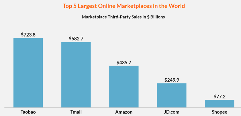 eCommerce giants like Alibaba, Amazon, and Taobao have registered a sharp increase in their revenues (based on 3rd party web sales) with their ecosystem of services. These marketplaces include: